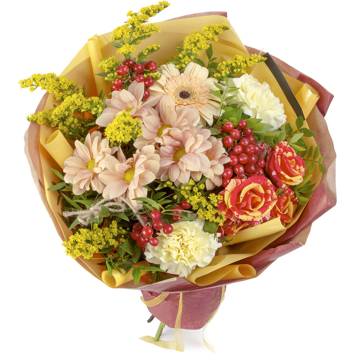 Хризантема кустовая, гербера, гвоздика пионовидная, роза кустовая двухцветная, статица желтая, гиперикум. Упаковка (лента, пленка, крафт, сетка, пленка матовая)