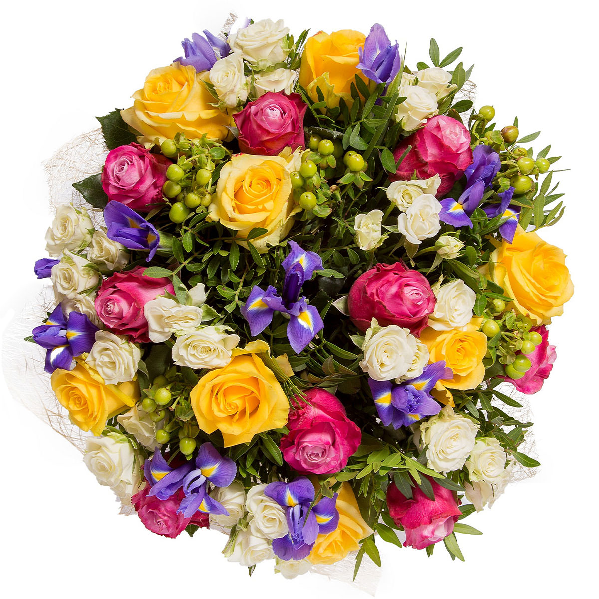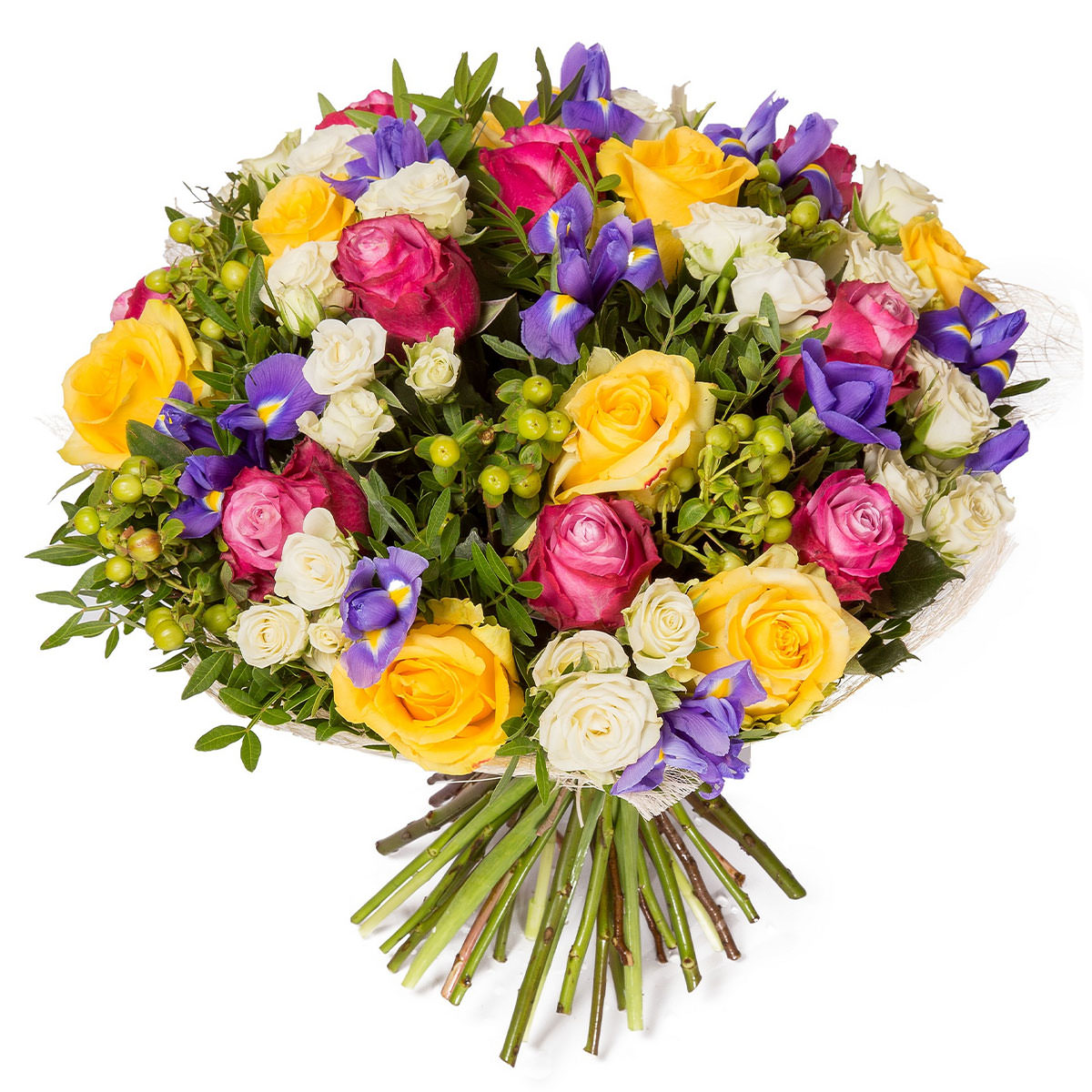 Роза одноголовая желтая и розовая, роза кустовая белая, ирис фиолетовый, зелень. Упаковка (лента, пленка, крафт, сетка, пленка матовая)