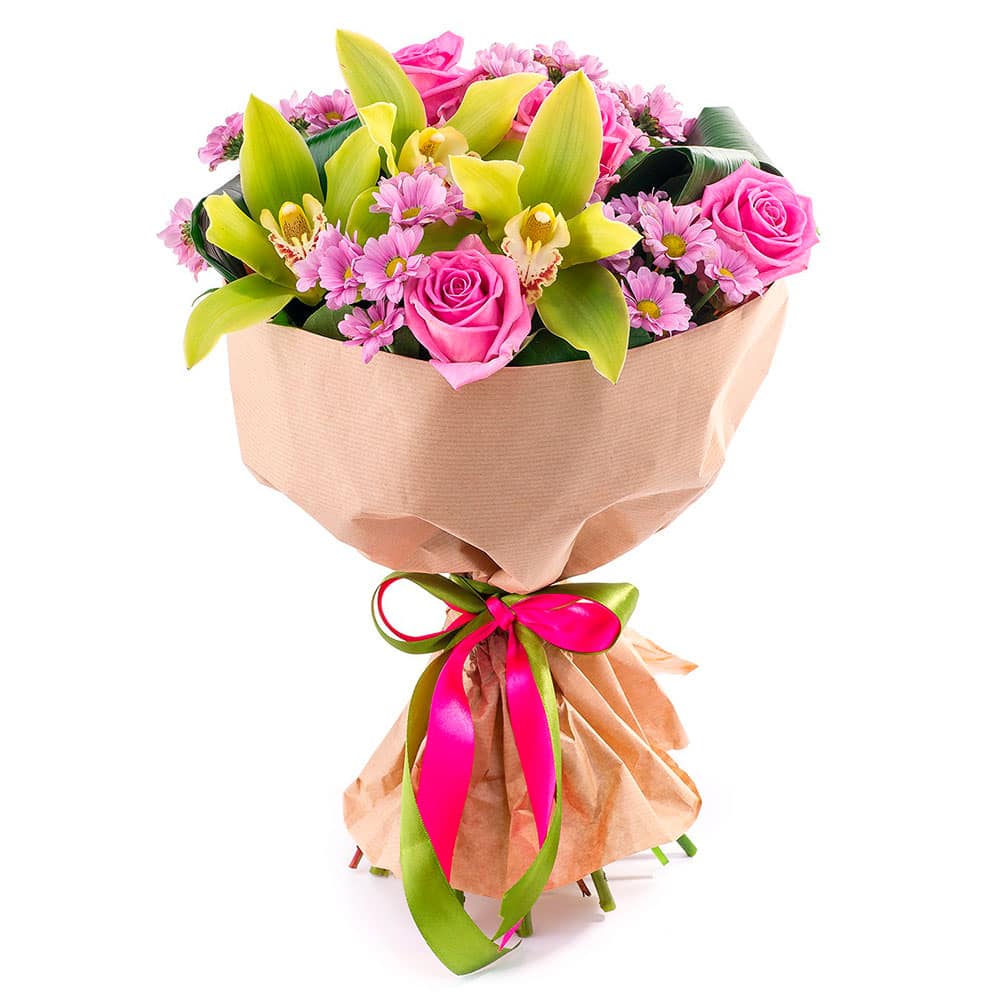 Орхидея желтая, хризантема кустовая сиреневая, роза одноголовая розовая, аспидистра. Упаковка (лента, пленка, крафт, сетка, пленка матовая)