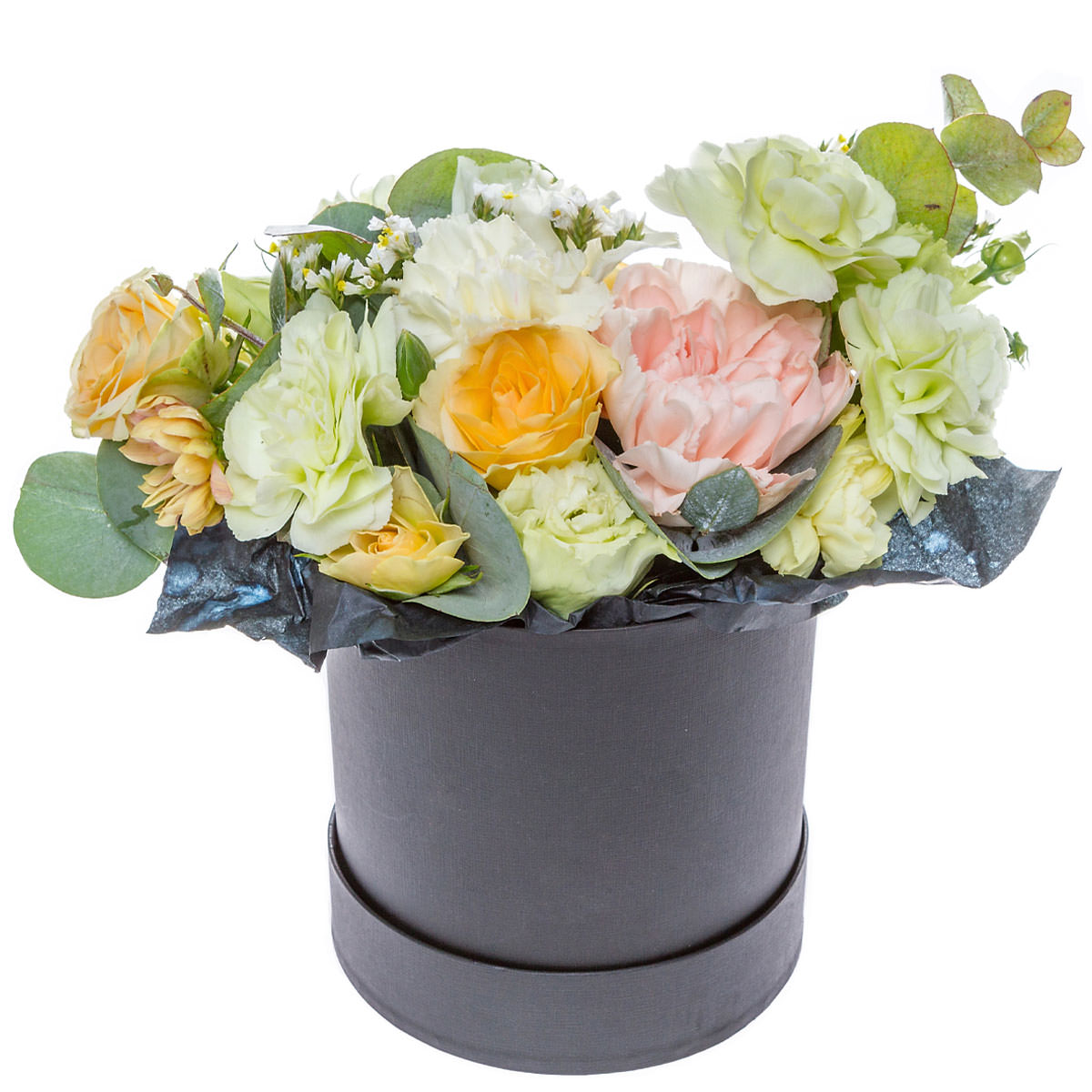 Роза кустовая желтая, пион розовый, гвоздика бело-зеленая, эустома белая, хризантема кустовая персиковая, статица белая, эвкалипт. Упаковка (шляпная коробка, квадратный бокс, коробка сердце, оазис)